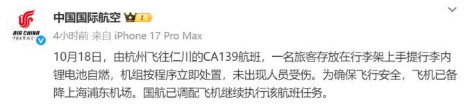 當(dāng)日午間,中國國際航空官方微博發(fā)文回應(yīng),10月18日,由杭州飛往仁川的CA139航班,一名旅客存放在行李架上手提行李內(nèi)的鋰電池自燃。機(jī)組按程序立即處置,未出現(xiàn)人員受傷。為確保飛行安全,飛機(jī)已備降上海浦東機(jī)場。目前國航已調(diào)配飛機(jī)繼續(xù)執(zhí)行該航班任務(wù)。