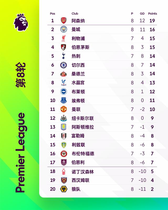 英超第 8 輪 7 場(chǎng)比賽結(jié)束后,阿森納繼續(xù)領(lǐng)跑,曼城升至第二位。