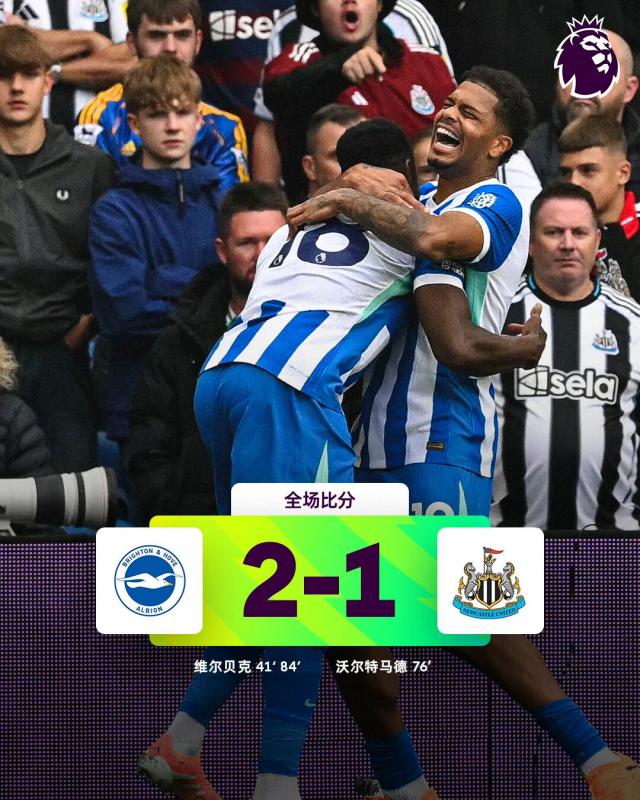 最終,布萊頓 2 - 1 擊敗紐卡斯?fàn)柭?lián),沃爾特馬德當(dāng)選球迷評(píng)選全場(chǎng)最佳球員。布萊頓在英超聯(lián)賽主場(chǎng)八場(chǎng)保持不?。? 勝 4 平)。紐卡斯?fàn)柭?lián)隊(duì)在英超聯(lián)賽客場(chǎng)已經(jīng)連續(xù)七場(chǎng)未嘗勝績(jī)(4 平 3 負(fù))。