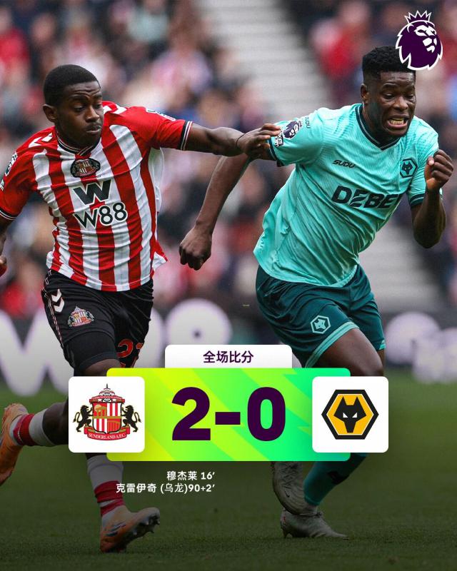 最終,桑德蘭 2 - 0 擊敗狼隊(duì),穆杰萊當(dāng)選球迷評(píng)選全場(chǎng)最佳球員。狼隊(duì)連續(xù)第二個(gè)賽季在前八場(chǎng)英超聯(lián)賽比賽中難求一勝。