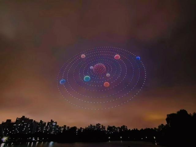 作為本屆游園會(huì)最引人矚目的“彩蛋”,10月18日晚,千架無人機(jī)在大寧湖上空依次升空,以天為幕、以光為筆,上演了一場(chǎng)極具視覺沖擊力的科技藝術(shù)秀。無人機(jī)群在夜空中精準(zhǔn)勾勒出絢爛的秋花、搖曳的秋葉以及公園標(biāo)志性的音樂噴泉等圖案,將白日的秋日美景于夜空璀璨重現(xiàn)。