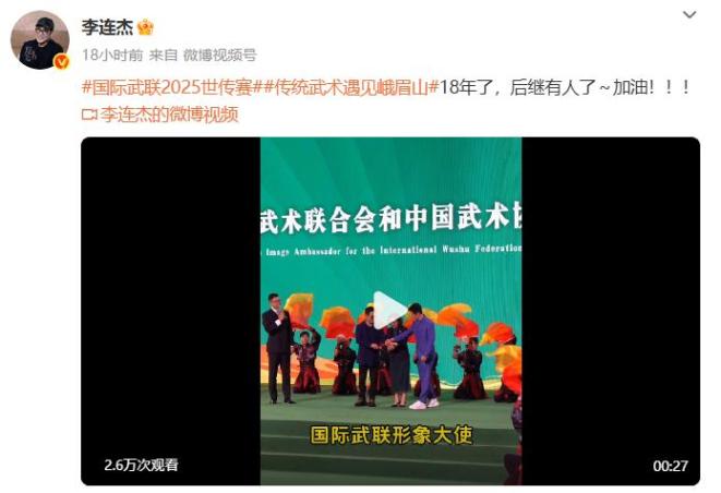 第十屆世界傳統(tǒng)武術錦標賽近日于四川峨眉山市舉辦。賽事期間,擔任了18年國際武術聯(lián)合會“武術形象大使”的知名影星李連杰正式卸任,將這一重任交棒給吳京。