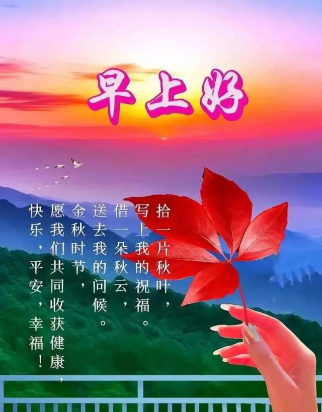 秋風涼爽,老友情親。清晨美好,短信傳情,送去問候,帶來美好。愿我們:身體健康,童心未泯,精神愉悅,生活美滿。早上好!