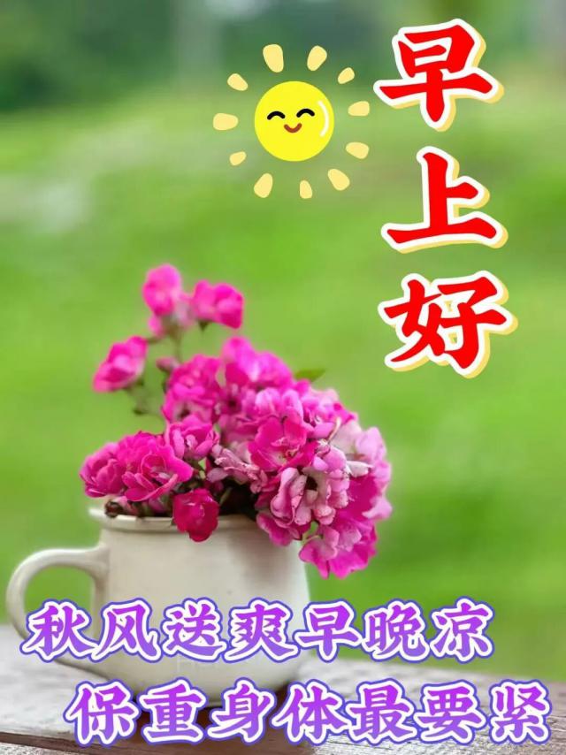 秋風送荷香,秋雨催天涼;秋蟬漸消,秋葉轉(zhuǎn)黃;秋高氣爽,秋景如畫。每日問候,安康吉祥!朋友笑容如陽,幸福如花綻放!愿你一帆風順,目標達成!早上好!