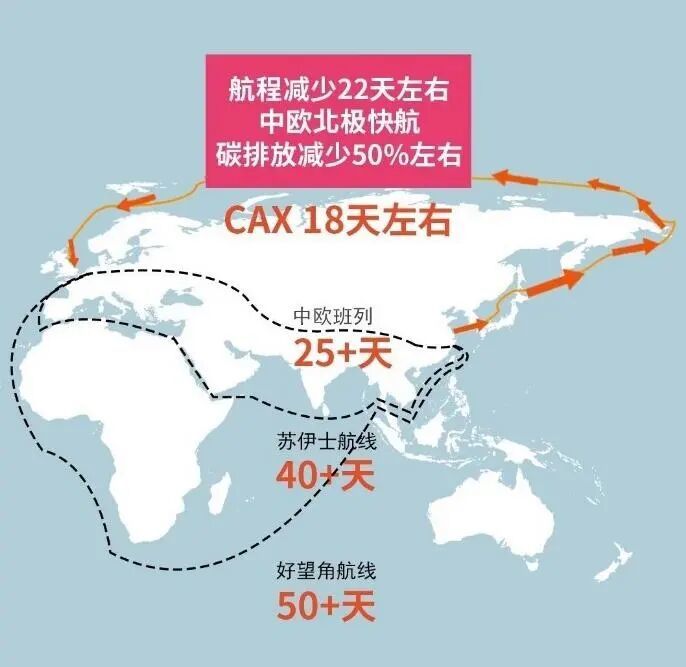據(jù)悉,中歐北極快航取道北極東北航道直達(dá)歐洲,僅用20天航程就抵達(dá)了歐洲首站費(fèi)利克斯托港。與蘇伊士運(yùn)河航線約40天以及好望角航線約50天的航期相比,該航線的時(shí)效優(yōu)勢十分明顯。