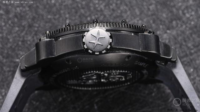 表側(cè)的黑色鈦金屬材質(zhì)采用了拉絲打磨工藝。9 時(shí)位置設(shè)有排氦閥,能保證上潛過程中腕表內(nèi)部穩(wěn)定。排氦閥沒有凸起,視覺上更統(tǒng)一,從正面看也很隱蔽。