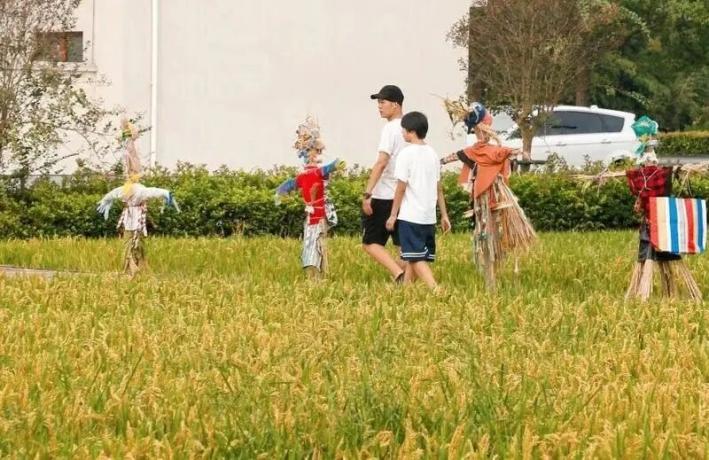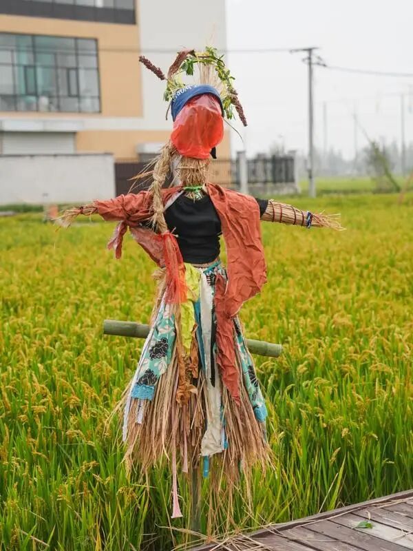 作品《稻草人》頭扎麻花辮、身著紅巾,在風中微微顫動,它不再是童話角色,更像一個承載真實記憶與溫度的農人化身。許多父母指著它對孩子說:“看,這就是守護稻田的衛(wèi)士?!痹谟H子互動間,關于守護、耕耘與豐收的古老智慧被悄然傳遞。