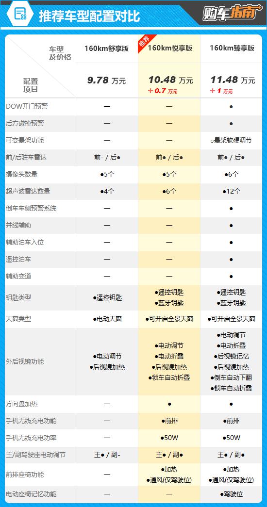 通過配置對比,160km 悅享版更值得推薦。其售價比入門車型貴 0.7 萬元,但配置增加了前駐車?yán)走_(dá)、外后視鏡電動折疊、前排手機無線充電、方向盤加熱、前排座椅加熱等實用功能,以較低成本大幅提升了用車體驗,物超所值。