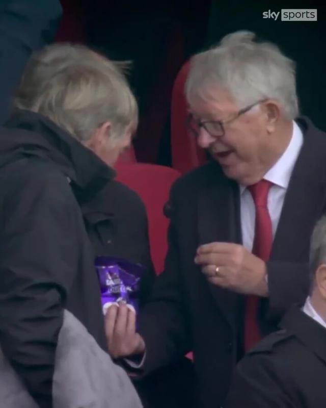 曼聯(lián)一球領(lǐng)先結(jié)束上半場(chǎng),弗爵在看臺(tái)上頗為輕松,還與利物浦名宿達(dá)格利什分享了巧克力。