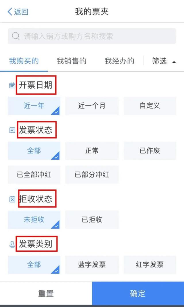 在票夾界面,可查看【我購買的】、【我銷售的】、【我經辦的】發(fā)票,也可點擊【篩選】,通過篩選開票日期、發(fā)票狀態(tài)、拒收狀態(tài)、發(fā)票類型等內容查看發(fā)票。
