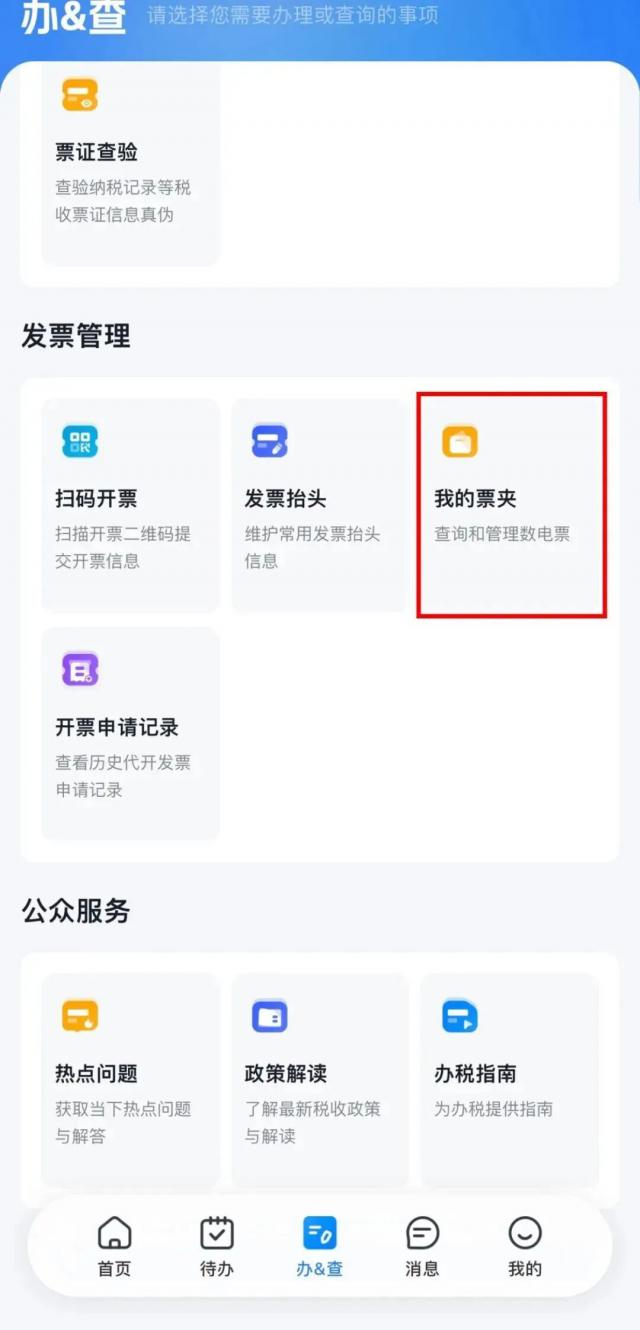 在【發(fā)票管理】欄點擊【我的票夾】,進入票夾界面。