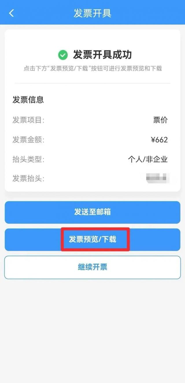 在確認后稍等片刻,即可成功換開電子發(fā)票。發(fā)票換開成功后,點擊【發(fā)票預覽 / 下載】可進行預覽和下載;點擊【發(fā)送至郵箱】可將發(fā)票發(fā)送至郵箱。