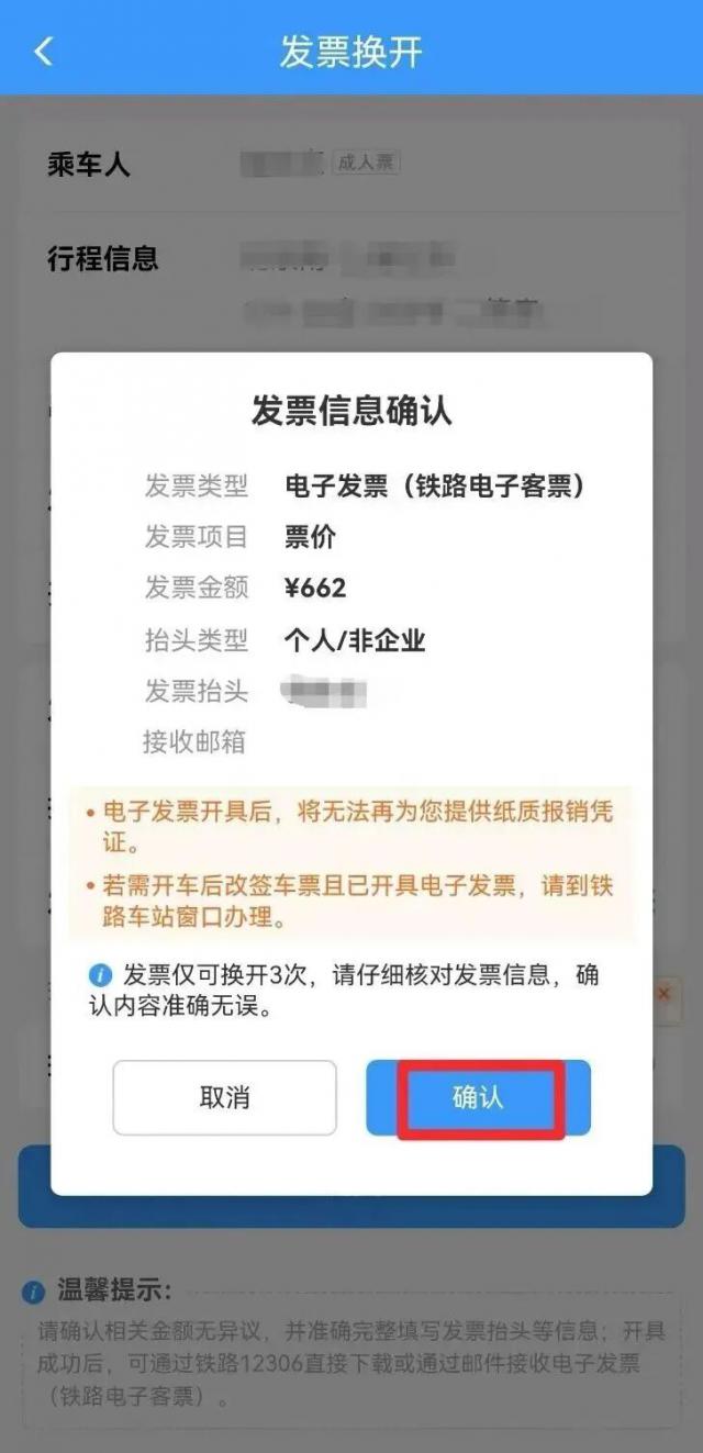 在溫馨提示“電子發(fā)票只可換開3次,請仔細填寫發(fā)票信息”頁面,點擊【確定】。