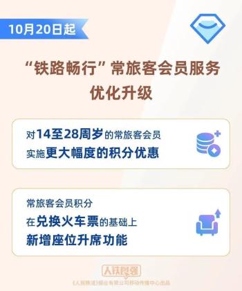 從10月20日起,國鐵集團將優(yōu)化升級“鐵路暢行”常旅客會員服務。對14至28周歲的常旅客會員實施更大幅度的積分優(yōu)惠,會員積分除了能兌換火車票,還新增了座位升席功能,常旅客會員積分的應用場景進一步拓展。