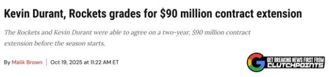 2年9000萬續(xù)約評(píng)級(jí):杜蘭特總薪金超詹皇獲A-,火箭保靈活性得B