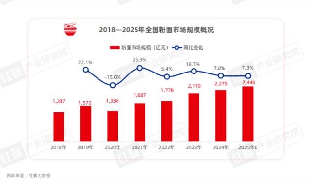 紅餐大數(shù)據(jù)顯示,2024年全國粉面品類市場規(guī)模達(dá)到2275億元,同比增長7.8%,2018 - 2024年年復(fù)合增長率達(dá)到10%,預(yù)計2025年將繼續(xù)保持7%以上的增速。