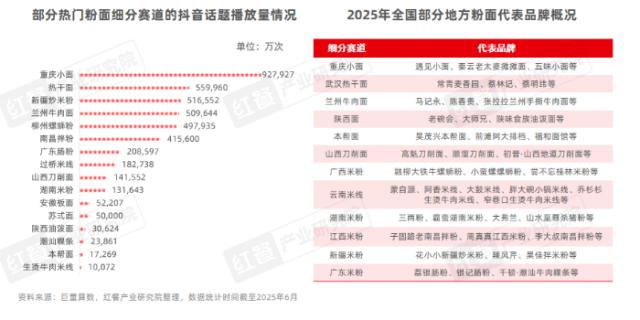 巨量算數(shù)顯示,截至2025年6月,重慶小面、熱干面、新疆炒米粉、蘭州牛肉面、柳州螺螄粉、南昌拌粉、廣東腸粉、過橋米線、湖南米粉、蘇式面、陜西油潑面、潮汕粿條、本幫面、生燙牛肉米線等話題在抖音平臺上的播放量均超過了1億次。
