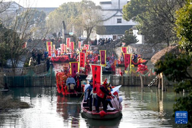 △ 2023年1月26日,在浙江省湖州市南潯區(qū)和孚鎮(zhèn)荻港村,漁船在水上古道巡游。新華社記者 黃宗治 攝