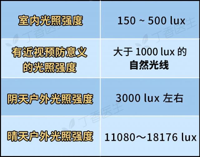 而且在戶外,即使是陰天,光照強(qiáng)度也有 1000 lux 以上。對(duì)近視有預(yù)防意義的光照強(qiáng)度在 1000 lux 以上,充足的光線能夠緩解眼部疲勞,保護(hù)視力,避免光照不足對(duì)視力造成損害。