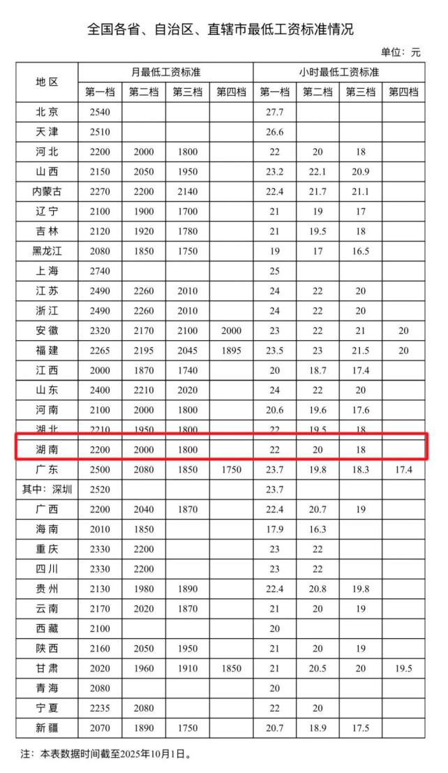 10月17日,人社部官網(wǎng)公布了全國各省、自治區(qū)、直轄市最低工資標準情況(截至2025年10月1日)。