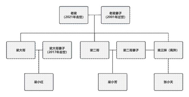 2021年,老梁去世,生前未立遺囑。老梁名下還有一套房子,老梁占2%,兩個(gè)孫女各占49%。就這套房子的繼承問(wèn)題,梁家兄妹三人有了不同的意見(jiàn)。這時(shí)梁三妹才發(fā)現(xiàn),當(dāng)年老梁家獲得的補(bǔ)償款和安置房并非按照人均比例分配。