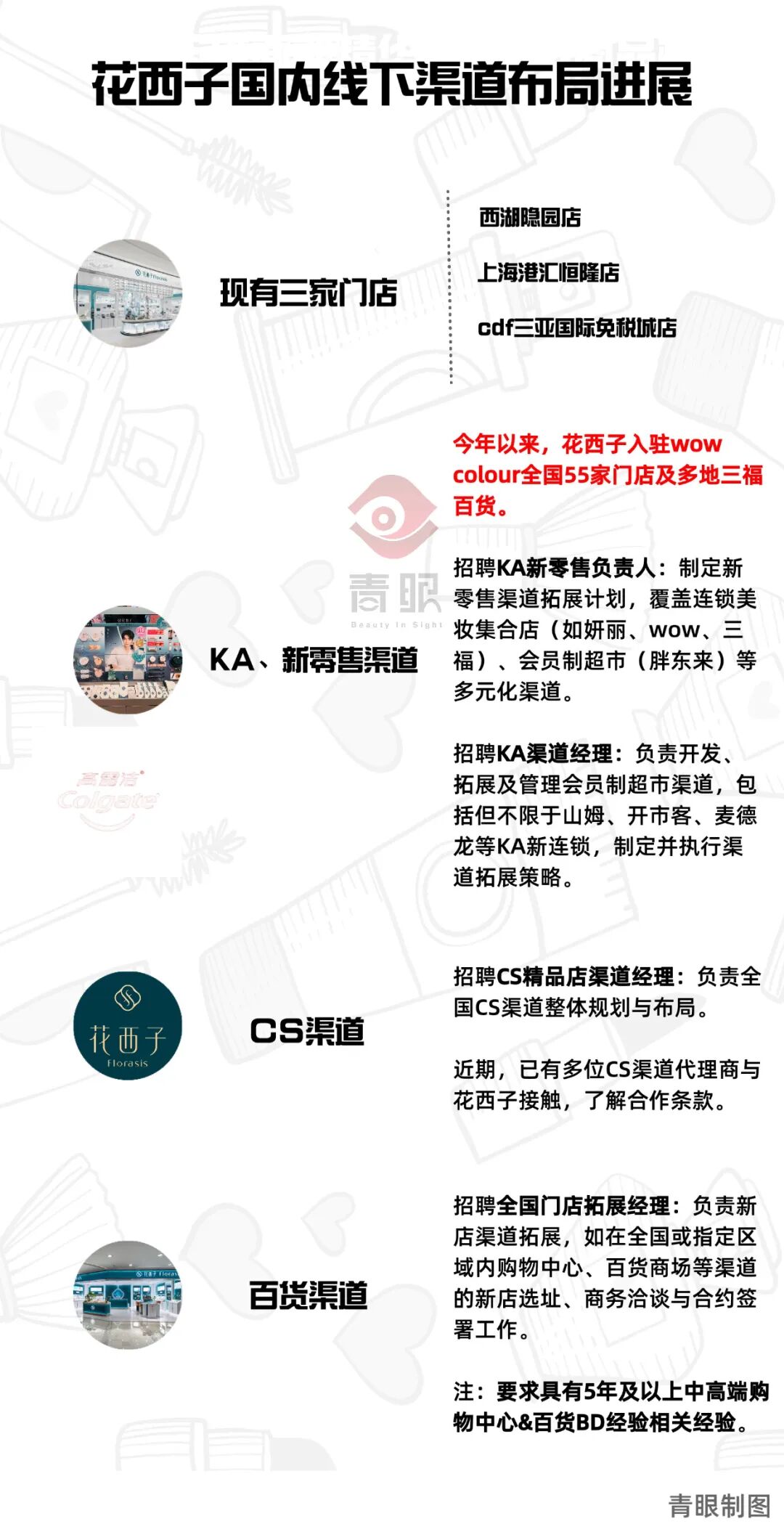 值得注意的是,對(duì)于近年市場(chǎng)份額有所縮減的CS渠道,花西子也在嘗試布局。據(jù)知情人士透露,花西子近期在進(jìn)行CS渠道招商,已有代理商與其接觸。一位從業(yè)多年的CS渠道代理商向青眼證實(shí),近期確實(shí)與花西子就品牌代理進(jìn)行了接觸,但最終未達(dá)成合作。招聘平臺(tái)顯示,花西子正在招聘CS精品店渠道經(jīng)理,該崗位需負(fù)責(zé)全國(guó)CS(化妝品專營(yíng)店、區(qū)域百?gòu)?qiáng)連鎖)渠道的整體規(guī)劃與布局,制定執(zhí)行渠道發(fā)展策略,確保年度銷售目標(biāo)的達(dá)成。