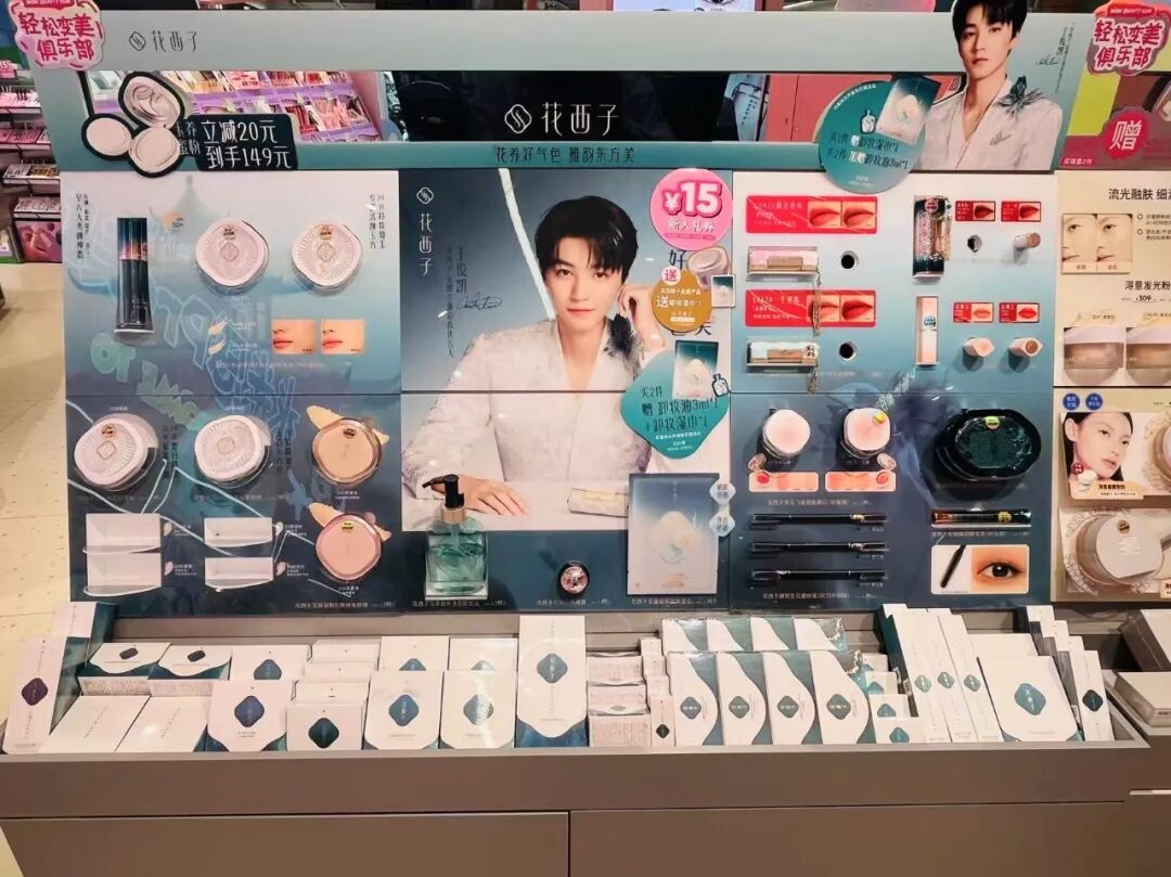 青眼走訪武漢某wow colour門店時(shí)發(fā)現(xiàn),“玉養(yǎng)蜜粉立減20元,到手149元”的促銷標(biāo)簽十分醒目,展柜靠近門口,近期官宣的首位品牌全球彩妝代言人王俊凱海報(bào)也格外顯眼。展柜上陳列著眉粉餅、玉養(yǎng)蜜粉、防曬妝前霜等花西子的暢銷產(chǎn)品,但近期發(fā)布的“氣色雙生”護(hù)膚系列并未出現(xiàn)。