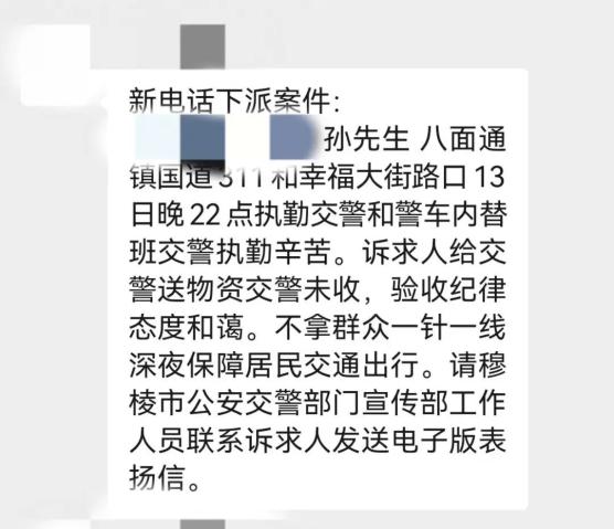 當(dāng)熱心市民帶著礦泉水、牛奶表達(dá)敬意時(shí),民警表示“心意我們領(lǐng)了,但東西不能收,這是我們的紀(jì)律”。他們用行動(dòng)詮釋平安守護(hù)義不容辭、嚴(yán)明紀(jì)律不折不扣,穆棱公安以公正嚴(yán)明的紀(jì)律作風(fēng)贏得轄區(qū)群眾贊譽(yù)。