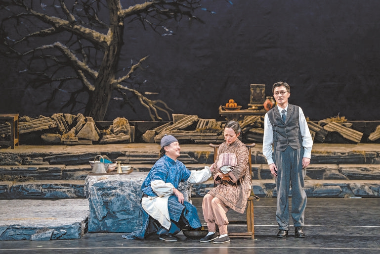 舞臺地面也從過去的雪地變成了石板地。石板參考了“圓明園”石頭的樣子,寓意著“石頭很頑強(qiáng),雖被摧殘過,但依然存在,并且會一直存在下去”。臺前幾盆老舍先生喜愛的菊花,依舊開得燦爛。