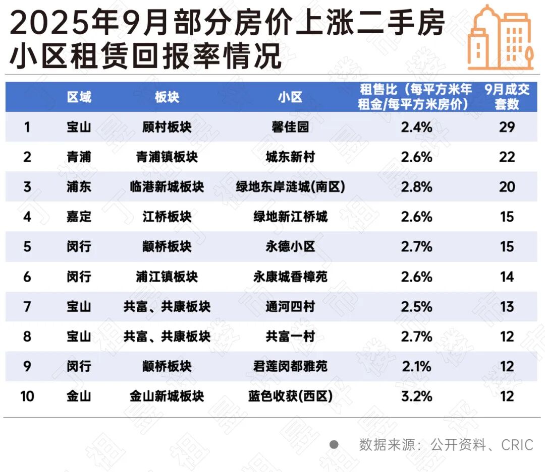 分區(qū)域來看,租賃回報率2%以上小區(qū)同樣大多在城市近遠郊片區(qū),如寶山、金山、松江等。這也進一步印證了剛需是推動房價止跌的核心力量。