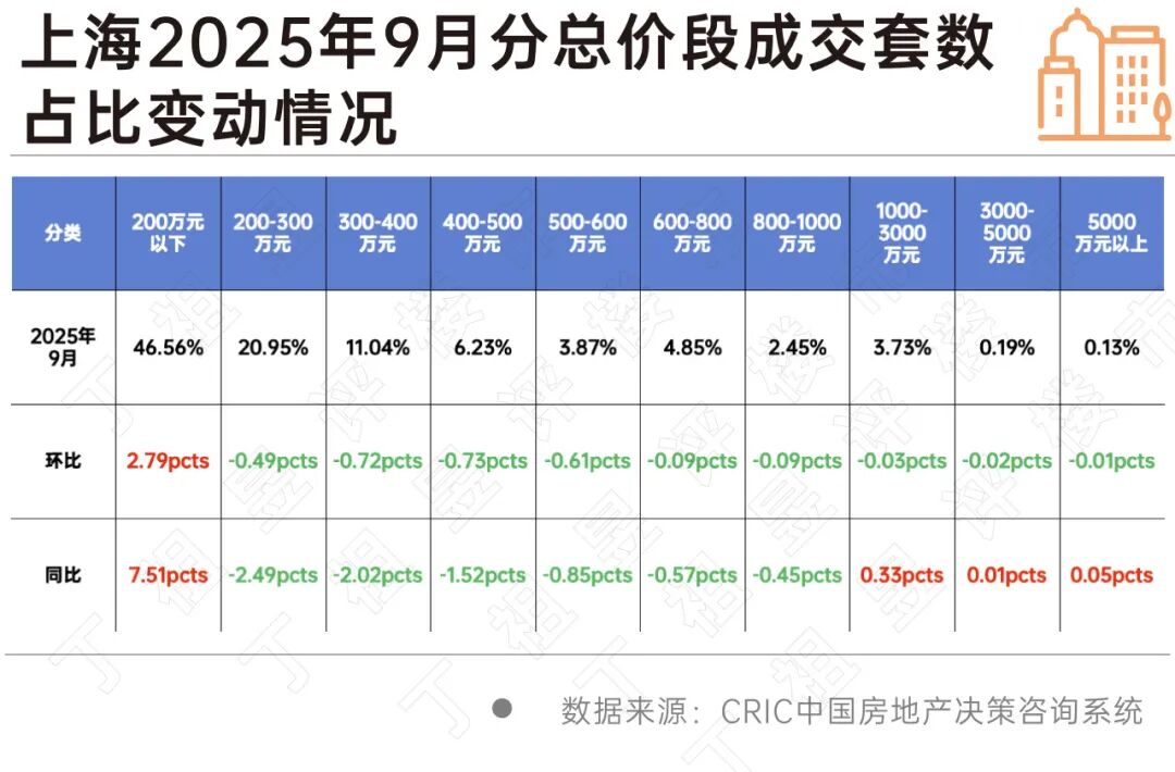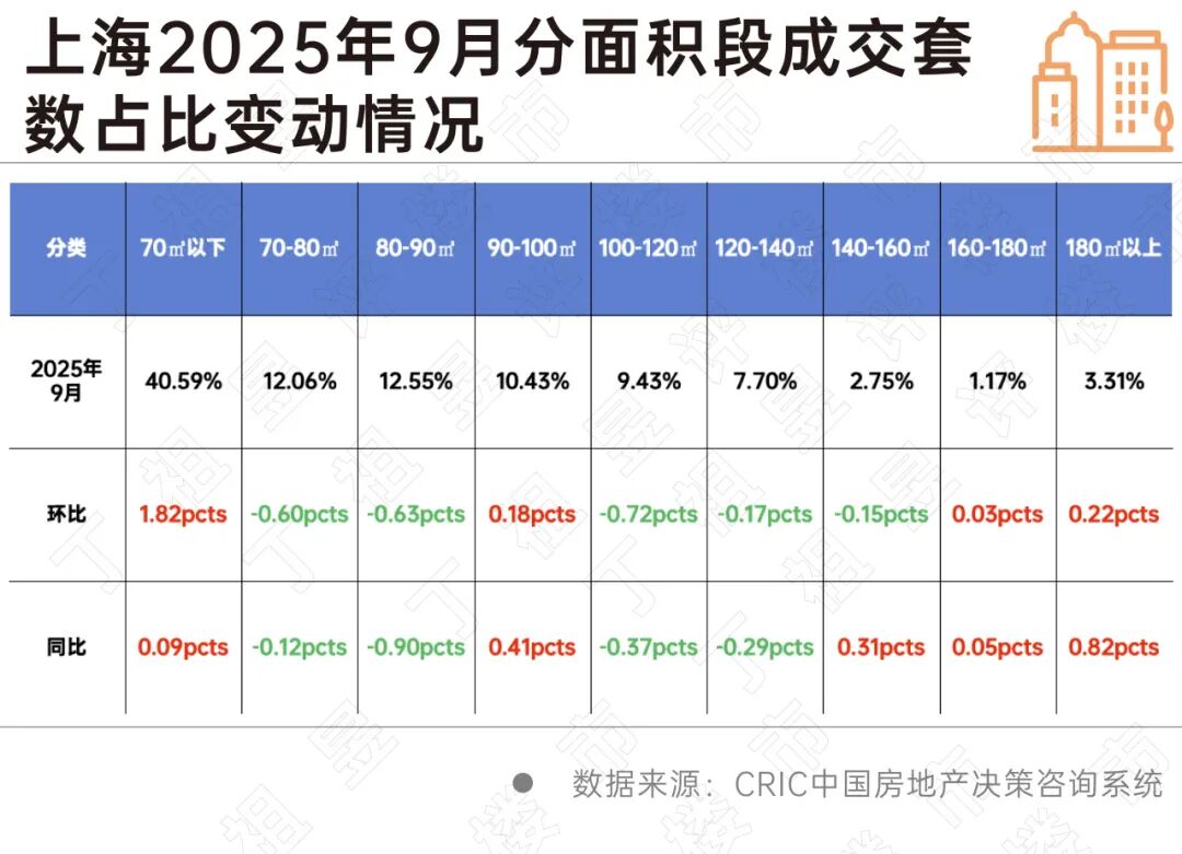 CRIC數據顯示,2025年9月總價200萬以內房源成交套數占比為46.56%,環(huán)比上升2.79pcts,同比上升7.51pcts;成交面積段中70平以內小面積段仍是成交主力,9月成交套數占比在40%以上。