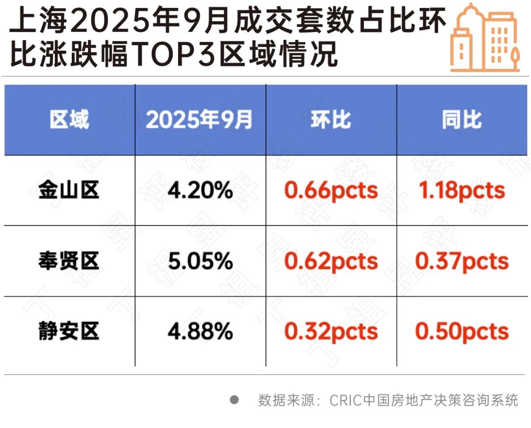 從成交區(qū)域來看,上海成交占比持增的多為城市近遠郊片區(qū),如上海金山區(qū)和奉賢區(qū)在9月成交套數占比排全市前2位,其中奉賢區(qū)成交占比達5.05%,環(huán)比上升0.62pcts,同比上升0.37pcts;金山區(qū)成交占比達4.2%,環(huán)比上升0.66pcts,同比上升1.18pcts。