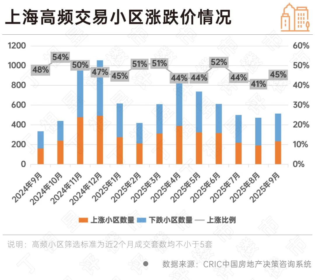從上海高頻交易小區(qū)漲跌價情況來看,近一年來,2025年8月是上海高頻交易小區(qū)成交價格上漲比例最少的一個月,僅41%小區(qū)上漲。進入9月,這一局面有所改善,房價上漲的高頻交易小區(qū)占比升至45%,從絕對數量看,9月房價上漲的高頻交易小區(qū)達233個,較8月環(huán)比增加21%。