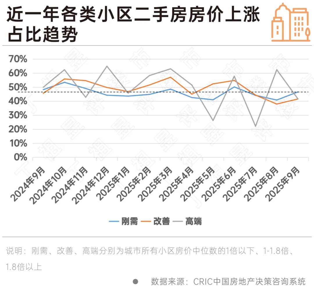 CRIC數據顯示,9月全上海有47%的剛需小區(qū)房價實現(xiàn)環(huán)比上漲,較上月增加6個百分點。相比之下,改善類小區(qū)房價上漲占比為42%,雖較上月提升4個百分點,但仍低于剛需類小區(qū)。