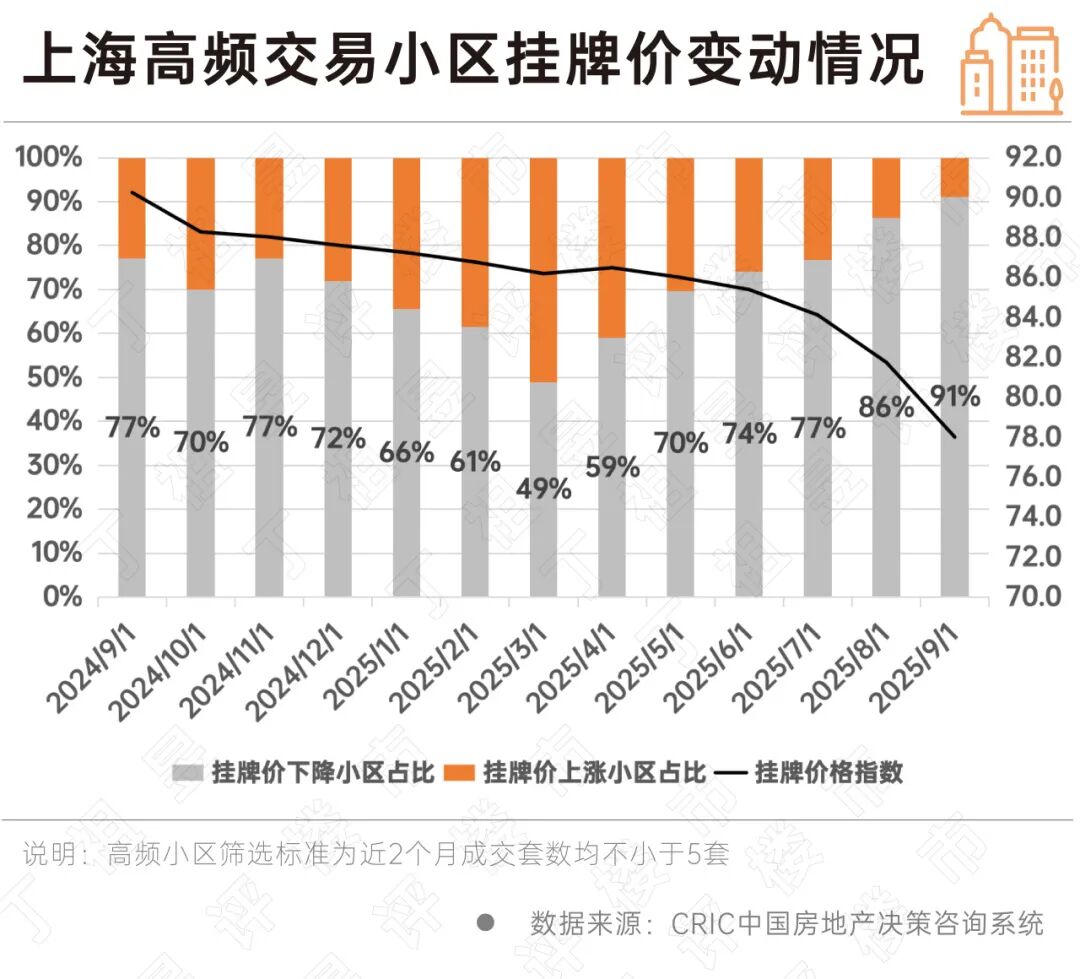 從上海高頻交易小區(qū)(連續(xù)兩月成交量≥5套)掛牌價變動情況來看,2025年二季度以來,上海下調掛牌價格的小區(qū)占比逐月上升,從3月的49%小區(qū)下調掛牌價格,攀升至9月的91%,創(chuàng)歷史新高。