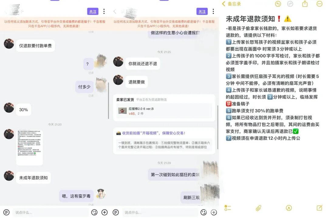 李云就是栽在這一點上,即便孩子剛剛下單2個小時,“全部訂單都沒有發(fā)貨”,其逐一和下單賣家溝通,其中有部分賣家在其通過支付寶私下支付了訂單金額30%的逃單費后,同意退款退貨。但也有態(tài)度十分惡劣的賣家,“他認(rèn)為我是成年人假裝未成年人下單故意退單”,對方發(fā)來一條須知,其中條款便包括扇孩子耳光。