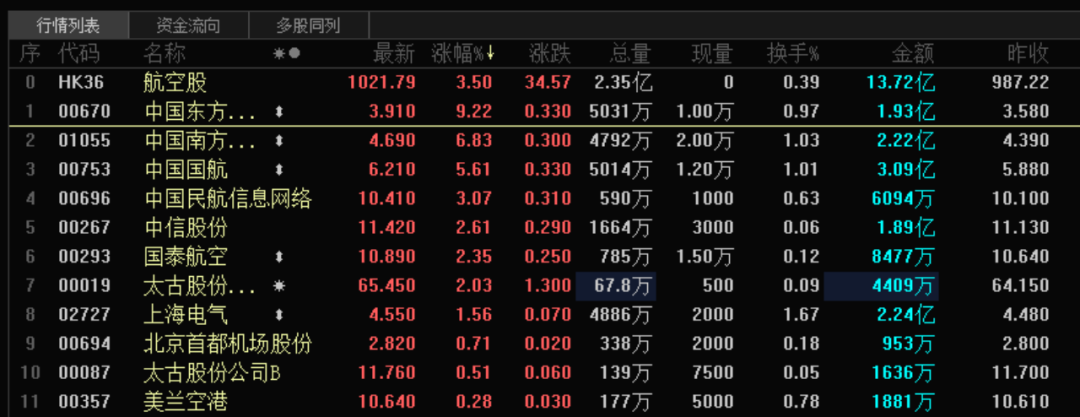今日午后,港股航空股持續(xù)走高,中國東方航空股份一度漲超10%,中國南方航空股份一度漲超7%,中國國航漲超5%,國泰航空跟漲。東方航空、南方航空、華夏航空等A股也是集體拉升。