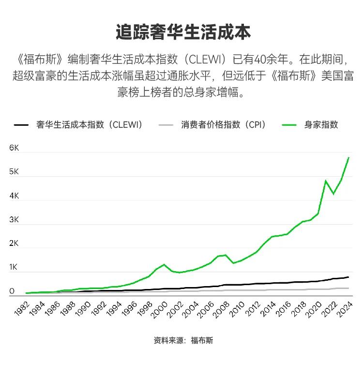 1982年,《福布斯》開始追蹤包括古馳樂福鞋、魚子醬、私人飛機等在內(nèi)的一籃子超奢華商品的價格,以衡量富豪群體面臨的通脹水平,可以視之為“《福布斯》美國富豪榜版CPI”。2024年,該指數(shù)上漲4.7%,同期CPI漲幅則為2.9%。這個指數(shù)或許能讓人了解整體通脹趨勢,即便不能,也能讓人在看到自己不斷上漲的食品支出時心里好受些,畢竟它的漲幅通常比常規(guī)CPI還要高。