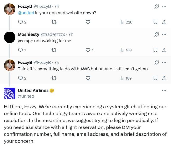 美聯(lián)航在X平臺(tái)上回復(fù)一位旅客時(shí)提到,“系統(tǒng)出現(xiàn)故障,影響了我們的在線工具”。