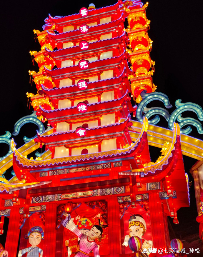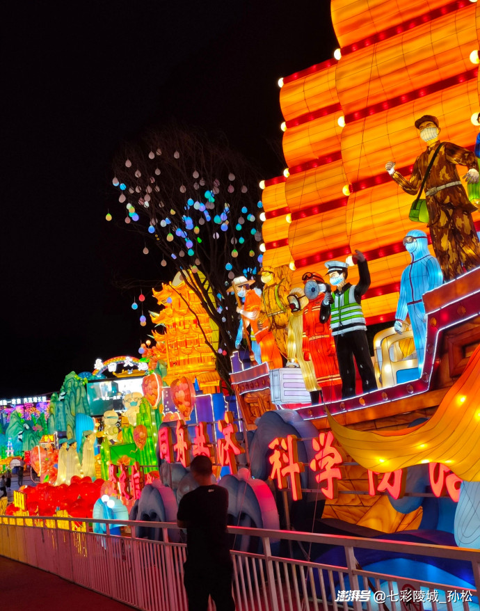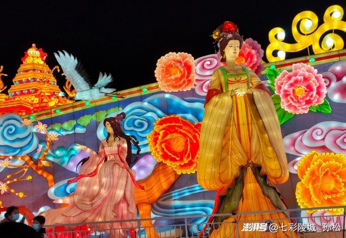 最讓我流連忘返的是“盛世長安”燈區(qū)。朱紅色的宮墻下,整條街都還原成了唐朝的景象:穿著漢服的“仕女”提著蓮花燈走過,發(fā)間插著珍珠步搖;“胡商”牽著駱駝,駝鈴叮當(dāng)響。中心廣場上,一座十米高的“燈樓”格外引人注目,每一層都雕刻著不同的故事——一層是李白舉杯邀月,二層是楊貴妃賞牡丹,三層還有我們課本里的“張騫出使西域”。媽媽說這燈樓用了三千多盞燈,師傅們花了一個月才組裝好。我仰著頭數(shù)燈樓上的小人兒,脖子都酸了,這時聽到旁邊一位老爺爺感嘆:“我小時候過年就盼著看燈,現(xiàn)在這燈啊,比畫本子里畫的還好看!”