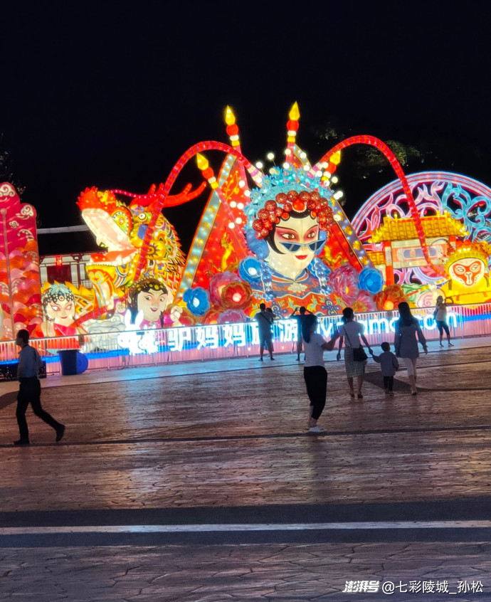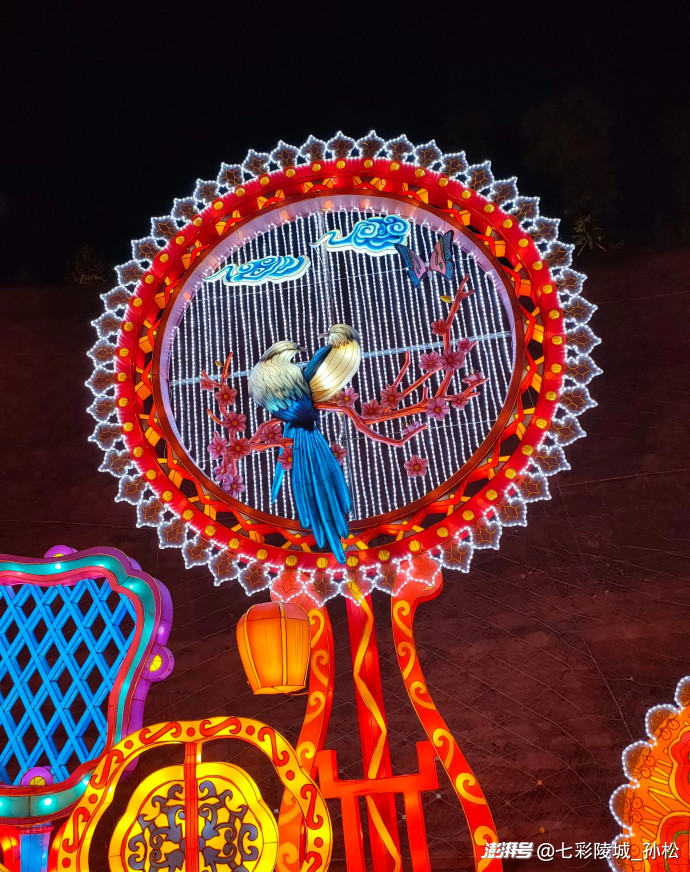 穿過掛著紅燈籠的入口拱門,“百鳥朝鳳”燈組首先映入眼簾。十幾米高的鳳凰矗立在山坡上,金紅色的羽毛層層疊疊,尾羽幾乎垂到地面,每一片羽毛上都點(diǎn)綴著細(xì)小的LED燈珠。隨著山風(fēng)輕輕晃動,仿佛馬上就要展翅高飛。鳳凰腳下圍繞著一圈藍(lán)綠相間的孔雀、火紅的朱鹮,就連最普通的麻雀也提著小燈籠,歪著頭向游客眨眼。媽媽趕忙舉起手機(jī)連拍,爸爸指著鳳凰冠上的明珠說:“那顆主燈有五百瓦,晚上十點(diǎn)前都不會暗?!?/p>