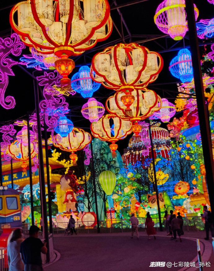 沿著青石板路向里走,燈光突然暗了下來。轉(zhuǎn)角處出現(xiàn)了一條“星河”——淺藍(lán)色的燈帶從頭頂垂落,像被風(fēng)吹散的瀑布,又像夏夜的銀河倒掛。兩側(cè)的荷花燈漂浮在水霧彌漫的池塘里,粉白的花瓣散發(fā)著柔和的光,荷葉上還“蹲”著幾只“螢火蟲”,一閃一閃地亮著黃綠色的小燈。妹妹蹲在欄桿邊伸手去抓“螢火蟲”,被爸爸笑著拉了回來:“別碰,那是感應(yīng)燈,碰壞了要賠的?!蔽铱粗嫔献约汉蜔粲爸丿B的倒影,感覺像是走進(jìn)了一幅會動的水墨畫。