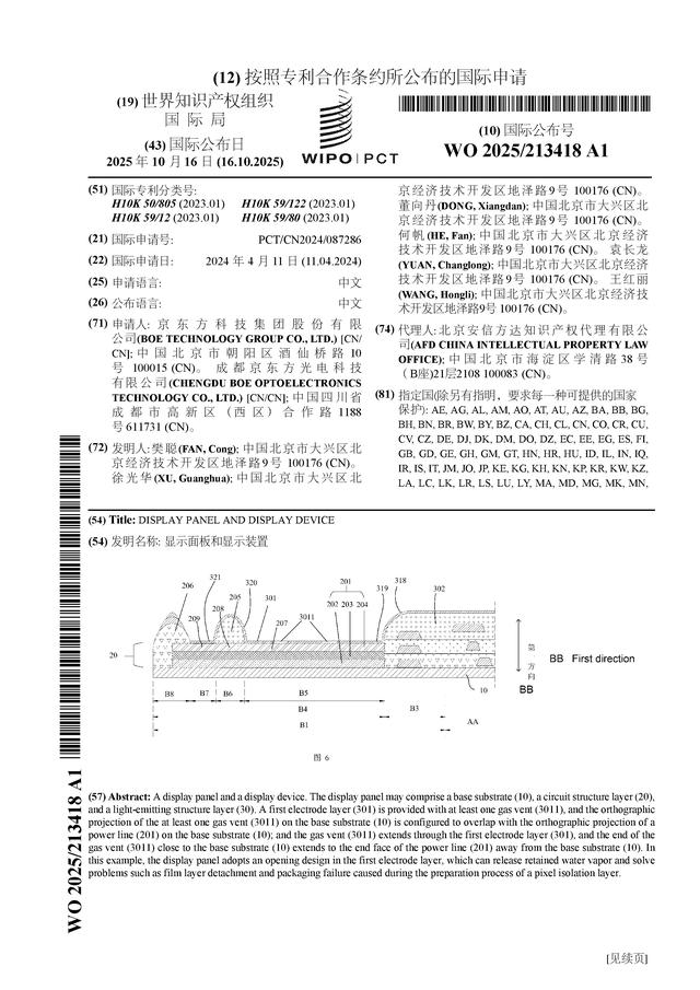 京東方A公布“顯示面板和顯示裝置”國際專利申請
