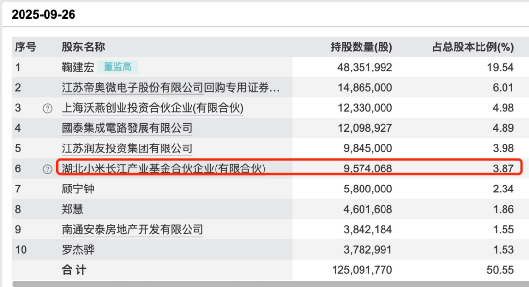 值得關(guān)注的是,此次收購方帝奧微與小米長江關(guān)系緊密,小米長江曾是帝奧微持股5%以上的股東。截至2025年9月26日,小米長江仍直接持有帝奧微3.87%的股份。