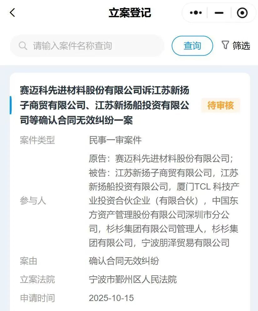 據(jù)杉杉股份9月底公告,重整投資人聯(lián)合體包括任元林控制的揚(yáng)子江金控旗下江蘇新?lián)P子商貿(mào)、揚(yáng)子江系公司“江蘇新?lián)P船投資”、TCL產(chǎn)投和東方資管深圳分公司,沒有賽邁科。