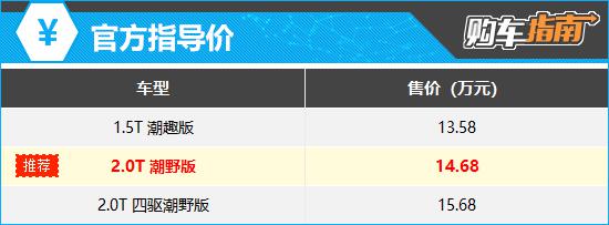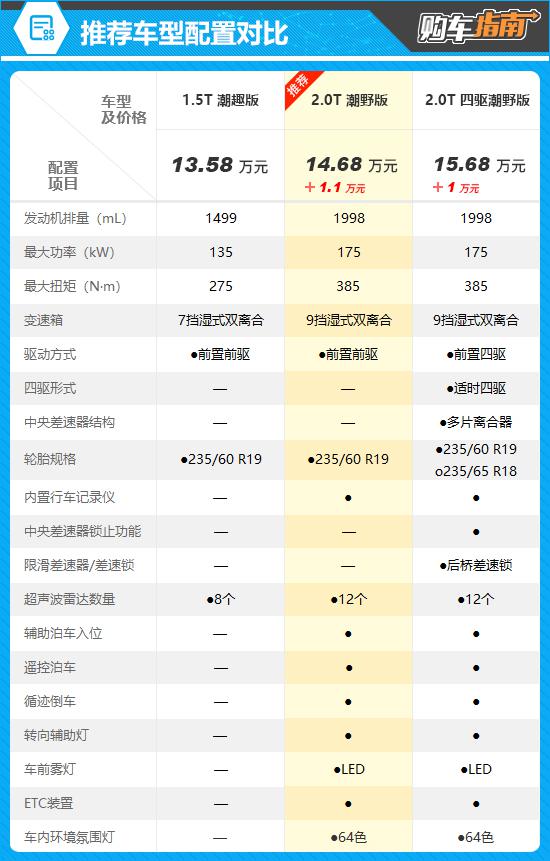 推薦車型為售價(jià)14.68萬(wàn)元的2.0T潮野版,相較低一個(gè)配置車型貴了1.1萬(wàn)元,最為核心的提升自然是換裝了動(dòng)力更為強(qiáng)勁的2.0T渦輪增壓發(fā)動(dòng)機(jī),傳動(dòng)系統(tǒng)也升級(jí)為9擋濕式雙離合變速箱。在我看來(lái),單憑動(dòng)力總成這點(diǎn)就已經(jīng)物有所值,畢竟對(duì)于這樣一款以全能屬性為賣(mài)點(diǎn)的中型SUV,動(dòng)力系統(tǒng)肯定不能拖后腿。除此之外,推薦車型還增加了一些錦上添花的實(shí)用性配置,例如內(nèi)置行車記錄儀以及遙控泊車等。