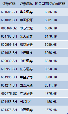 據(jù)Wind資料,目前全市場有13家“A+H”上市券商,分別是華泰證券、中國銀河、申萬宏源、光大證券、招商證券、中信建投、中信證券、東方證券、中金公司、國泰海通、廣發(fā)證券、國聯(lián)民生、中原證券。