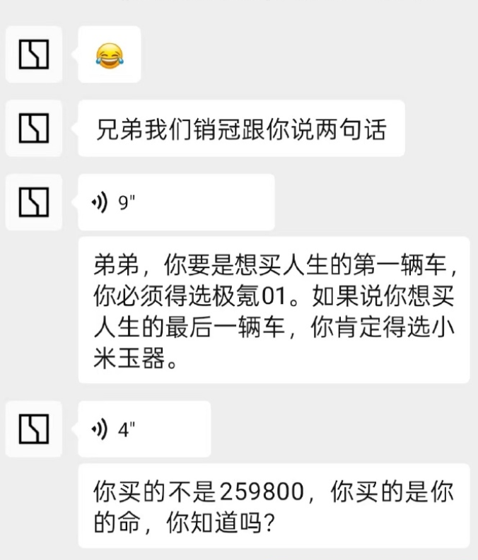 該銷(xiāo)售還回復(fù)稱:“兄弟我們銷(xiāo)冠跟你說(shuō)兩句話。”隨后銷(xiāo)冠發(fā)語(yǔ)音稱:“弟弟,你要是想買(mǎi)人生的第一輛車(chē)你必須得選極氪01。如果說(shuō)你想買(mǎi)人生的最后一輛車(chē),你肯定得選小米YU7。你買(mǎi)的不是259800,你買(mǎi)的是你的命,你知道嗎?”