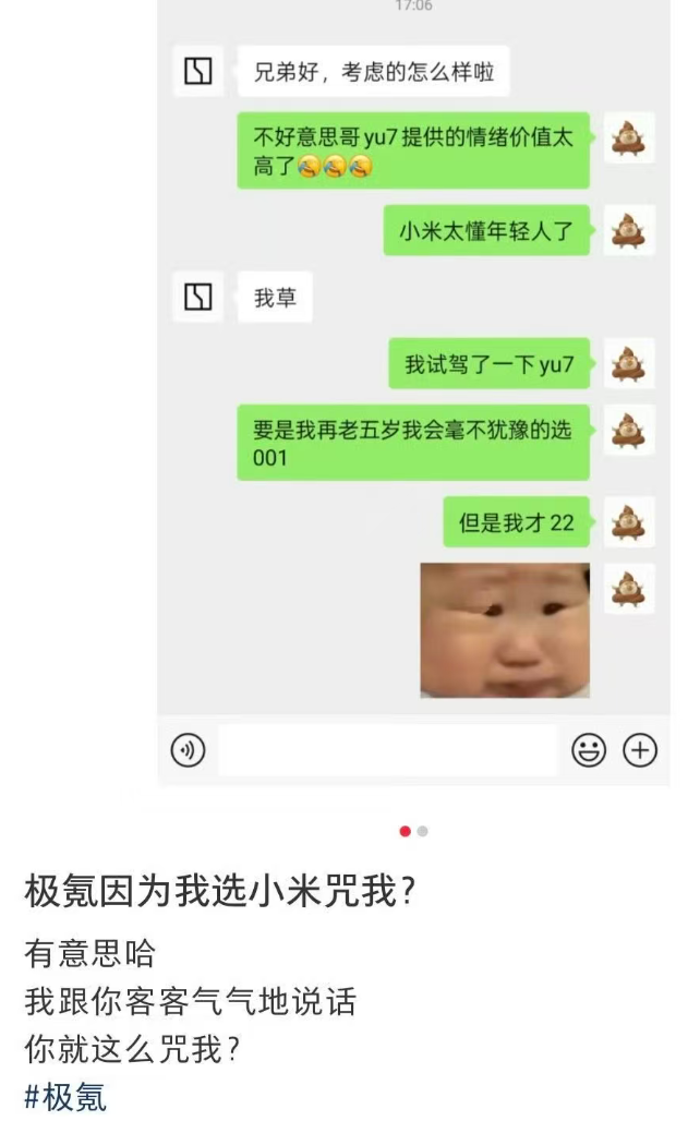 DoNews10月21日消息,20日,有用戶在社交平臺(tái)發(fā)帖稱,自己因選擇購(gòu)買(mǎi)小米汽車(chē),遭到極氪銷(xiāo)售的“詛咒”。該銷(xiāo)售表示“如果說(shuō)你想買(mǎi)人生的最后一輛車(chē),你肯定得選小米YU7”。