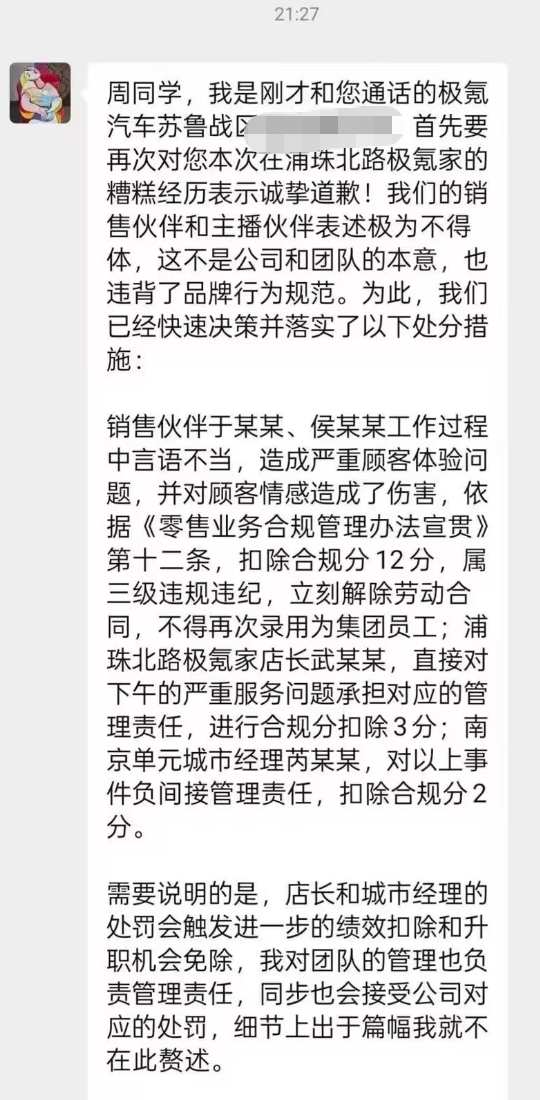 極氪方面表示,銷(xiāo)售伙伴和主播伙伴表述極為不得體,這并非公司和團(tuán)隊(duì)的本意,也違背了品牌行為規(guī)范。為此,極氪快速?zèng)Q策并落實(shí)了處分措施:銷(xiāo)售伙伴于某某、侯某某工作過(guò)程中言語(yǔ)不當(dāng),造成嚴(yán)重顧客體驗(yàn)問(wèn)題,還傷害了顧客情感,依據(jù)《零售業(yè)務(wù)合規(guī)管理辦法宣貫》第十二條,扣除合規(guī)分12分,屬三級(jí)違規(guī)違紀(jì),立刻解除勞動(dòng)合同,不得再次錄用為集團(tuán)員工;浦珠北路極氪家店長(zhǎng)武某某,直接對(duì)下午的嚴(yán)重服務(wù)問(wèn)題承擔(dān)對(duì)應(yīng)的管理責(zé)任,進(jìn)行合規(guī)分扣除3分;南京單元城市經(jīng)理芮某某,對(duì)以上事件負(fù)間接管理責(zé)任,扣除合規(guī)分2分。